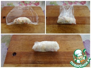 Рисовую бумагу опускаем в воду на несколько секунд. На бумагу кладем 1 ст. л. начинки и сворачиваем как фаршированный блин.