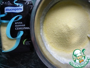Всыпать манную крупу Семолина ТМ"Мистраль", смешанную с разрыхлителем. Перемешать до однородности