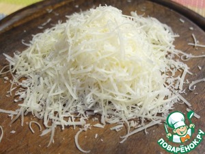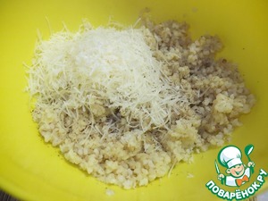 Готовую крупу солим, перчим, добавляем пармезан и 2 зубчики чеснока, пропущенного через пресс