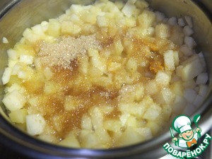 Готовим начинку. Яблоки очищаем от кожи, нарезаем мелким кубиком. Всыпаем в кастрюльку и ставим на небольшой огонь.