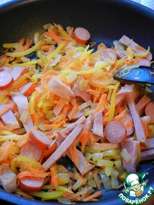 Окорок и колбаски нарезаем небольшими ломтиками, добавляем к овощам и обжариваем все вместе около 5 минут.