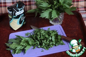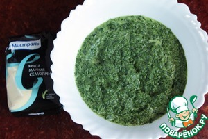 Измельчить нарезанную зелень блендером на сколько возможно. В ходе экспериментов с зеленью в моих условиях я пришла к выводу, что лучше это делать в узком стакане (я приспособила литровую баночку), перекладывая яйцом, вверху яйцо. Тогда зелень легче поддается измельчению.