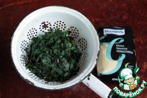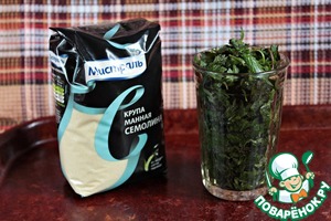 Добавить 1 стакан семолины торговой марки "Мистраль" и 2/3 стакана просеянной муки пшеничной. Тщательно перемешать.