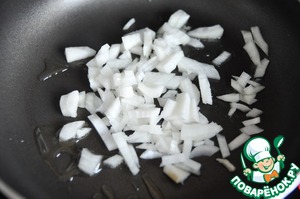 Репчатый лук (одну луковицу) нарезаем мелкими кубиками и обжариваем до прозрачности на растительном масле (1 ст. ложка), на сковороде.