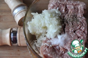 Берём любой мясной фарш, у меня свиной, добавляем измельчённый лук (1 шт.). Если вы сами делаете фарш, то соответственно мясо перекручиваете вместо с луком. Я измельчала блендером.