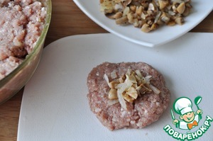 Для этого берём фарш, расплющиваем в лепёшку, на середину кладём столовую ложку жареных грибов. -