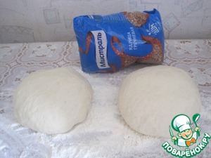 Для первого кусок теста раскатываем круглую лепешку толщиной 3-4 мм, укладываем на сковороду