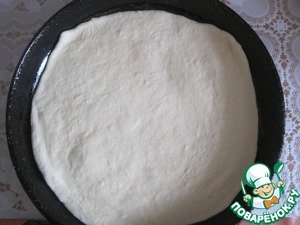 Для первого кусок теста раскатываем круглую лепешку толщиной 3-4 мм, укладываем на сковороду -