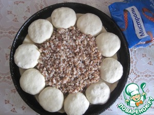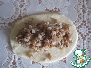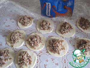 • Раскатываем 10 маленьких лепешек, укладываем посередине фарш из гречки и мяса, защипываем в круглые пирожки.