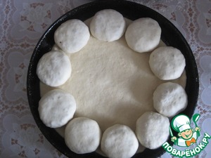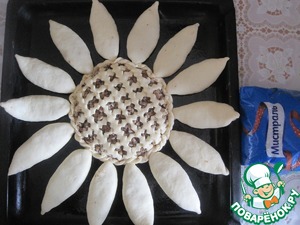 • Укладываем пирожки швом вниз к кругу в виде подсолнуха. Растаиваем, смазываем яйцом, выпекаем