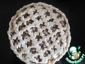 Делаем украшения для пирога. Растаиваем, за 10 мин до выпечки смазываем яйцом. Выпекаем.