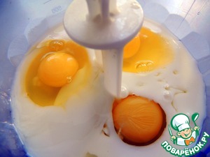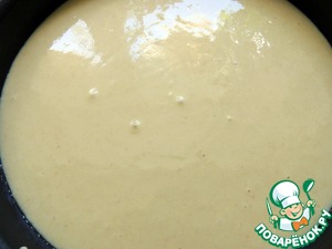 В тесто добавить сахар, муку, соду и ванилин. Всё хорошенько перемешать и вылить в смазанную маслом форму.