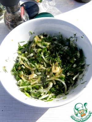 Смешать лук и зелень в миске, добавить любимые специи (у меня розмарин, зира и кориандр).