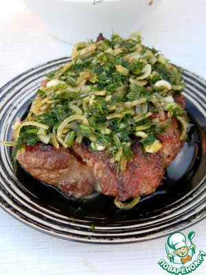 Существует мнение, что лучшие повара — мужчины. Может быть! Возможно, готовить мясо лучше получается у людей этого пола. Но я хотела немного опротестовать это мнение и приготовить мясо для своего мужчины без его помощи, и чтобы он оценил по достоинству. А мясо я готовила не просто на сковороде, а на собственноручно разожжённом мангале, что опять же доказывает, что и здесь женщина не беспомощна. Приступая к рецепту, вспомнила ещё один совет по приготовлению мяса, что солить его либо совсем не надо, либо перед самым приготовлением. Так оно остается сочным и нежным. Зная, что мой муж не принимает такое мнение и несоленое мясо есть не будет, я решила подать его с сочным и ароматным "салатом" из лука, зелени и соевого соуса. Мясо я пожарила большим куском на открытом огне, по-настоящему так, по-мужски. Уважаемые дамы, не бойтесь экспериментировать и делать вроде как невозможные вещи. Уверяю, ваш мужчина (супруг, отец, друг или коллега) будет приятно удивлен и немножко поражен, что вы сделали это сами. Плюс высоко будет оценен такой знак внимания. В этом рецепте я опишу поэтапно, что я делала и свои ощущения. Мой муж "пищал" от удовольствия, ему я угодила на все сто. Вам интересно? Прошу в рецепт.