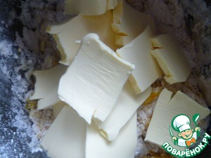 Затем наливаю теплое молоко и мягкий нарезанный сливочный маргарин.