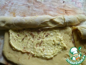 Половину теста раскатала, смазала густым слоем творожной начинки. -