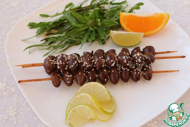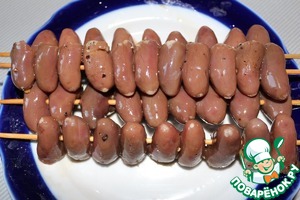 Готовые сердечки нанизываем на шпажки (предварительно замоченные в холодной воде) и обжариваем по 4 минуты с каждой стороны (обжарить их нужно на хорошо разогретой сковороде и на сильном огне, иначе они будут просто вариться!).