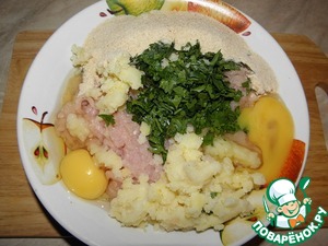 К куриному фаршу добавить картофельное пюре, яйца, измельченную петрушку и панировочные сухари.