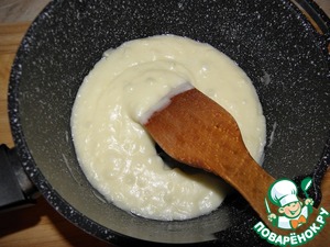 добавить муку и, постоянно мешая, влить тонкой струйкой стакан кипятка.