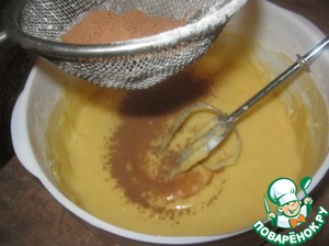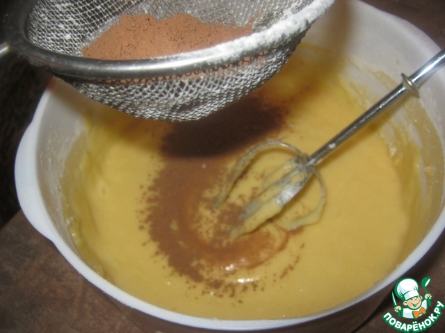 Просеиваем какао и тоже вводим в смесь. Перемешали. Тесто готово!