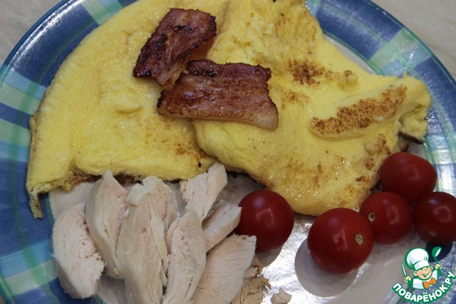 Вкус этого омлета умеренный - в меру сладкий, и в меру соленый - поэтому его можно подать как с грудинкой и овощами, так и полив вареньем. Я выбрала первый вариант