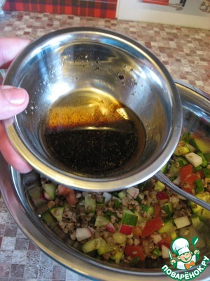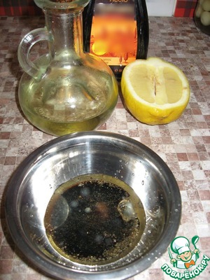 • Для заправки смешиваем соль, перец, масло, бальзамический уксус и лимонный сок