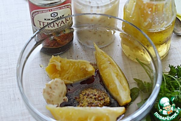 1. В чашке смешать горчицу, соевый соус, мед, белый перец, масло.