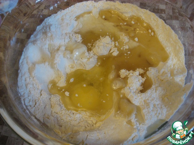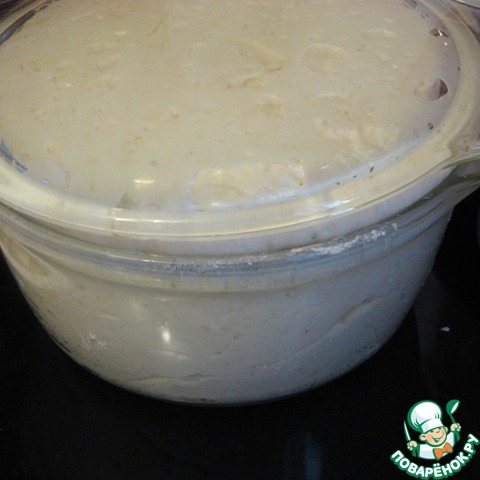 Для начала в воде разболтать венчиком 3-4 ст. л. муки, всыпать сухие дрожжи, размешать. Оставить на 15 минут, чтобы эта масса поднялась "шапочкой"