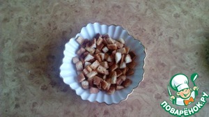 Наши обрезки режем на квадратики, выкладываем на сухую сковородку, присыпаем приправой, тщательно перемешиваем, добавляем 1 ст. л подсолнечного масла, снова перемешиваем, приправа схватилась и начинаем сушить сухари, в прямом смысле этого слова!)))