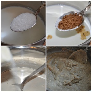 Для шоколадной прослойки в турке соедините 2 столовые ложки несладкого какао-порошка и 2 столовые ложки сахара, влейте 50 мл. молока. Варите 2–3 минуты.