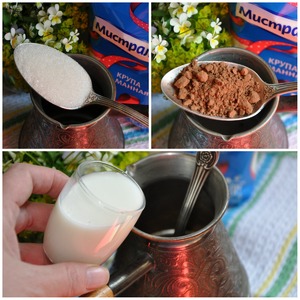 Для мусса соедините 300 мл молока, 4 столовые ложки сахара, 2 столовые ложки кофе и соль в сотейнике, поставьте на средний огонь, вскипятите. Варьируйте количество кофе в зависимости от Вашего вкуса - можно всегда добавить или уменьшить количество. Тонкой струйкой всыпьте манную крупу. Варите кашу при постоянном помешивании примерно 7–8 минут. Каша должна получится густой. Снимите с огня, накройте крышкой и отставьте.