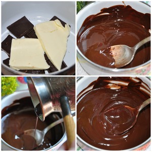 Растопите темный шоколад на водяной бане. Добавьте 40 грамм сливочного масла комнатной температуры, хорошо перемешайте. После чего смешайте 2 шоколадные массы до однородности. Слегка остудите получившийся шоколадный соус.