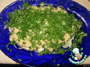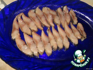 Сельдь чистим и разделываем на филе. Чтобы легче это было сделать, нужно завернуть её плотно в газету, и немного постучать о стол. Тогда отделить её от костей будет значительно легче. Нарезаем филе небольшими кусочками.