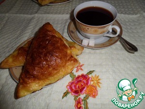 Выкладываем пирожки - треугольники на противень на пергамент. Смазываем желтком. Выпекаем 20-25 минут при 150-160 градусах.