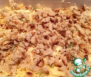 Сверху залейте сливками и молоком. Присыпьте мелко накрошенным хлебом.