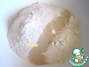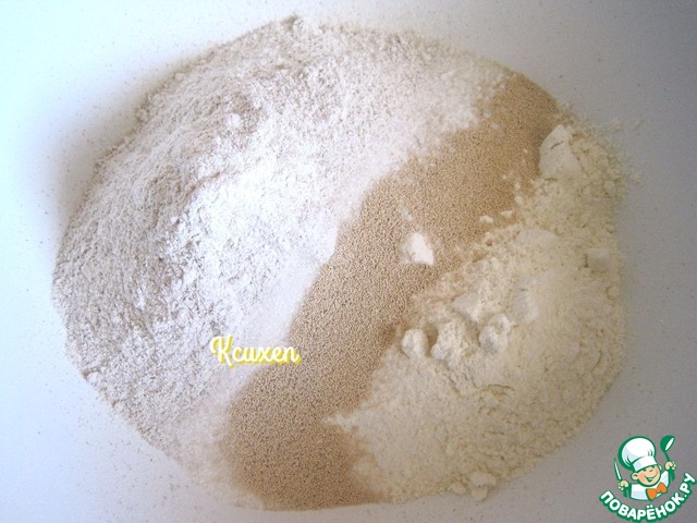 Пока настаивается солод, в отдельной посуде смешаем два вида муки, соль, сахар и сухие быстрорастворимые дрожжи - те, которые не нужно предварительно активировать в тёплой воде.