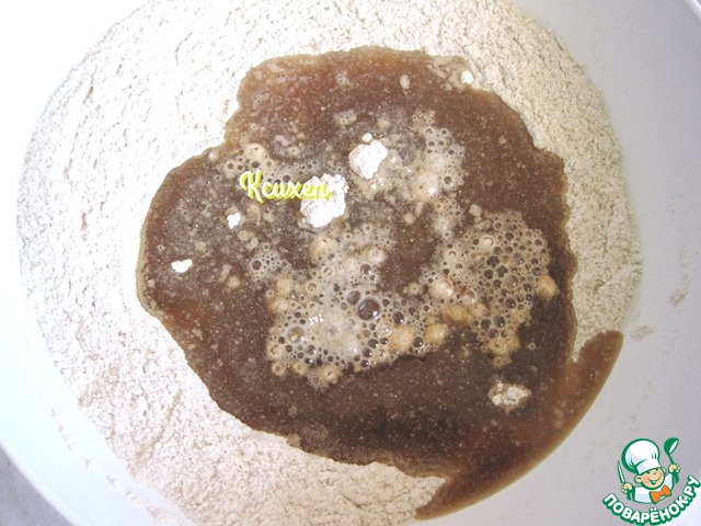 Далее в мучную смесь выливаем солодовую "заварку", белковую смесь и оливковое масло. -
