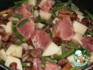 Потом добавить к мясу грибы, фасоль, порезанный кубиками картофель.