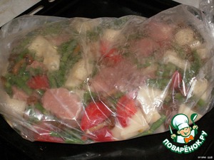 Сложить овощи с мясом в рукав для запекания, добавить туда пол-стакана воды, концы рукава смотать проволочкой (она продаeтся в комплекте).