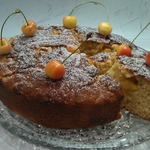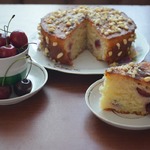 Осторожно вмешать черешню в тесто. Дно и бока формы (диаметр 20 см.) застелить смазанной растительным маслом бумагой для выпечки, выложить тесто, поставить для расстойки на 15-20 минут. Выпекать 30-35 мин. до сухой лучинки. Готовый пирог остудить в форме. Выложить на блюдо пирог, обмазать верх и бока любым джемом, посыпать верх и бока миндальными лепестками, украсить кокосовой стружкой, свежей черешней и листиками мяты.
