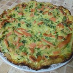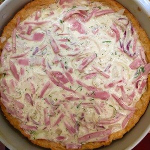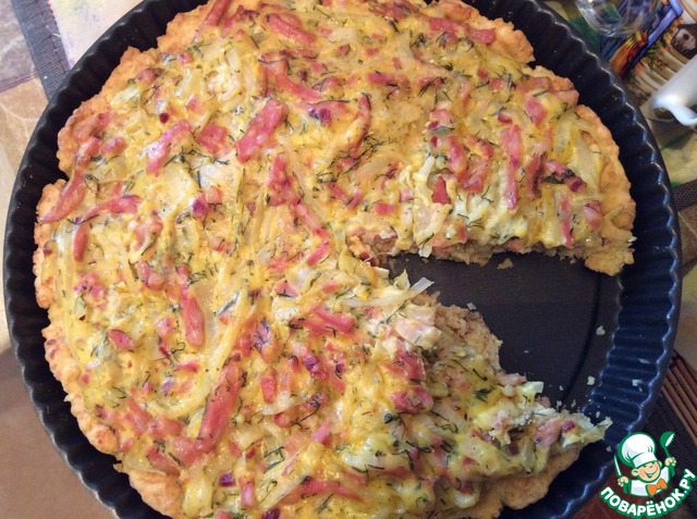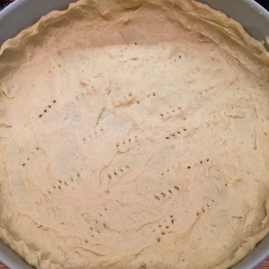 Размазываем с остервенением по форме, делая небольшие бортики и протыкаем кое-где вилкой. Ставим в духовку при 200 градусах минут на 15. В это время готовим начинку.