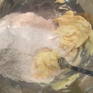 В мягкое масло добавляем погашенную соду и перемешиваем. Добавляем муку и снова хорошо мешаем.