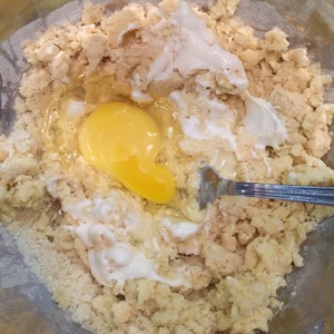 Добавляем сметану и яйцо, солим немного и замешиваем эластичное тесто. Как только перестало липнуть к рукам-останавливаемся, иначе станет резиновым.