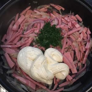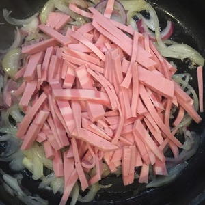 Добавляем колбасу, нарезанную соломкой и еще 2 минутки тушим.