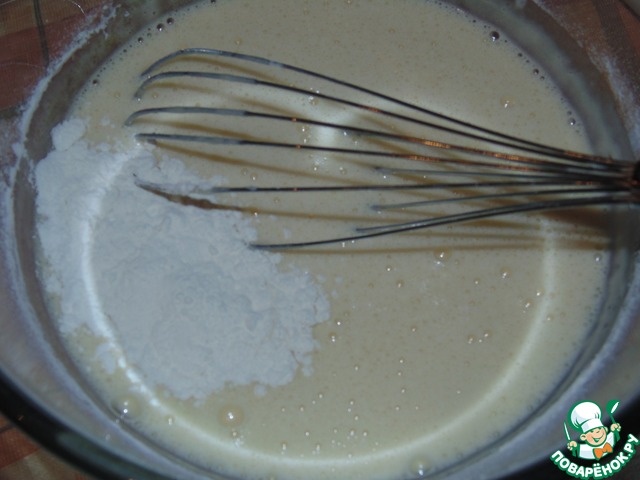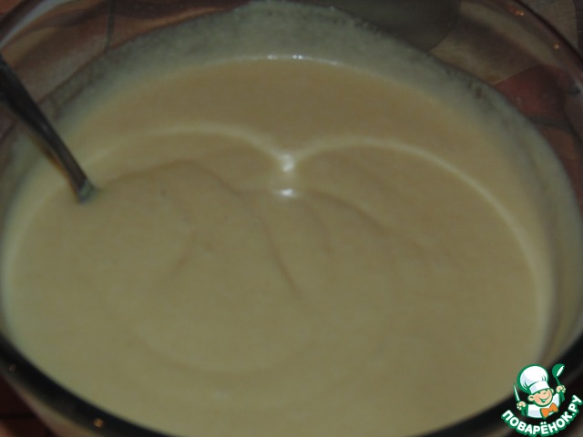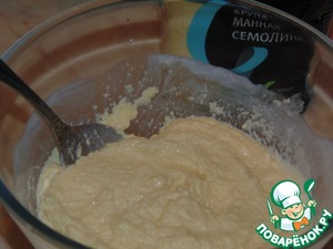 В тесто постепенно вводить манку, помешивая ложкой. (от сильного взбивания может получится очень плотное тесто)