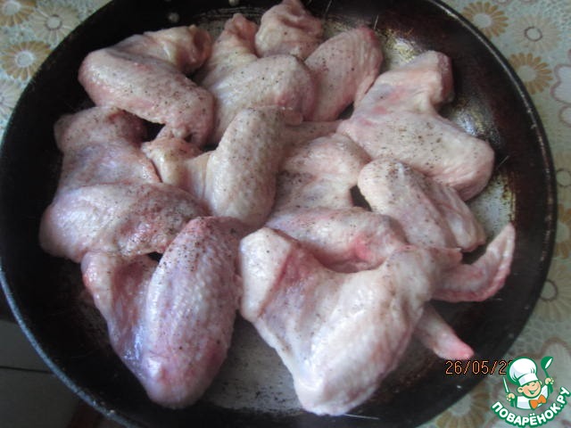 Крылья вымыть, посолить, поперчить, сковороду слегка смазать подсолнечным маслом, выложить мясо. Поставить жарить в духову на 30 минут
