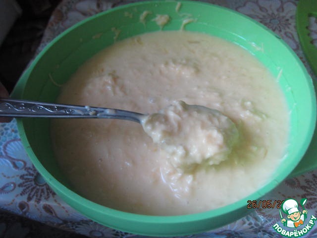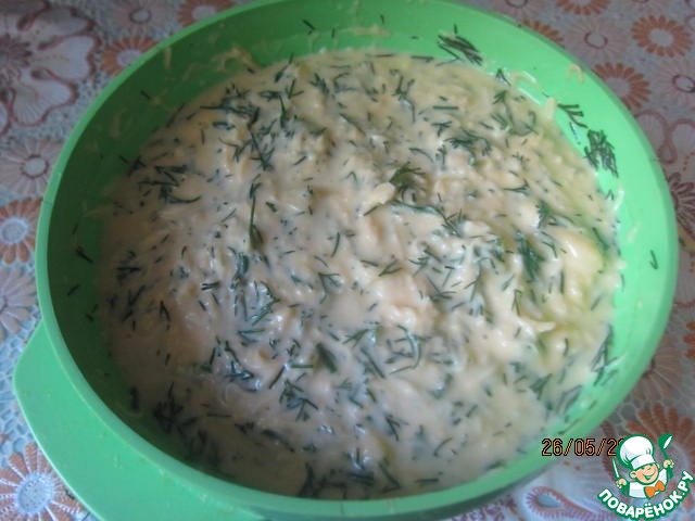 Натираем сыр на мелкой терке, и постепенно добавляем в смесь яиц и майонеза. Должна получится довольно густая масса.