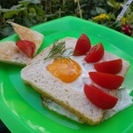 Укладываем на сковороду, в серединку разбиваем яйцо и сверху кладем помидорку, немного вдавливая, и накрываем крышкой.