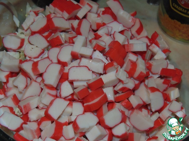 Крабовые палочки тоже нарезать кубиком, не очень мелко.