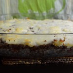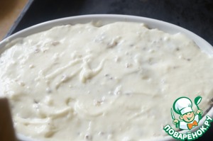 Наверх выложить соус и распределить по всему верху запеканки. Запекать в разогретой до 180 гр. духовке около 40-45 минут. Подавать к столу в теплом виде.